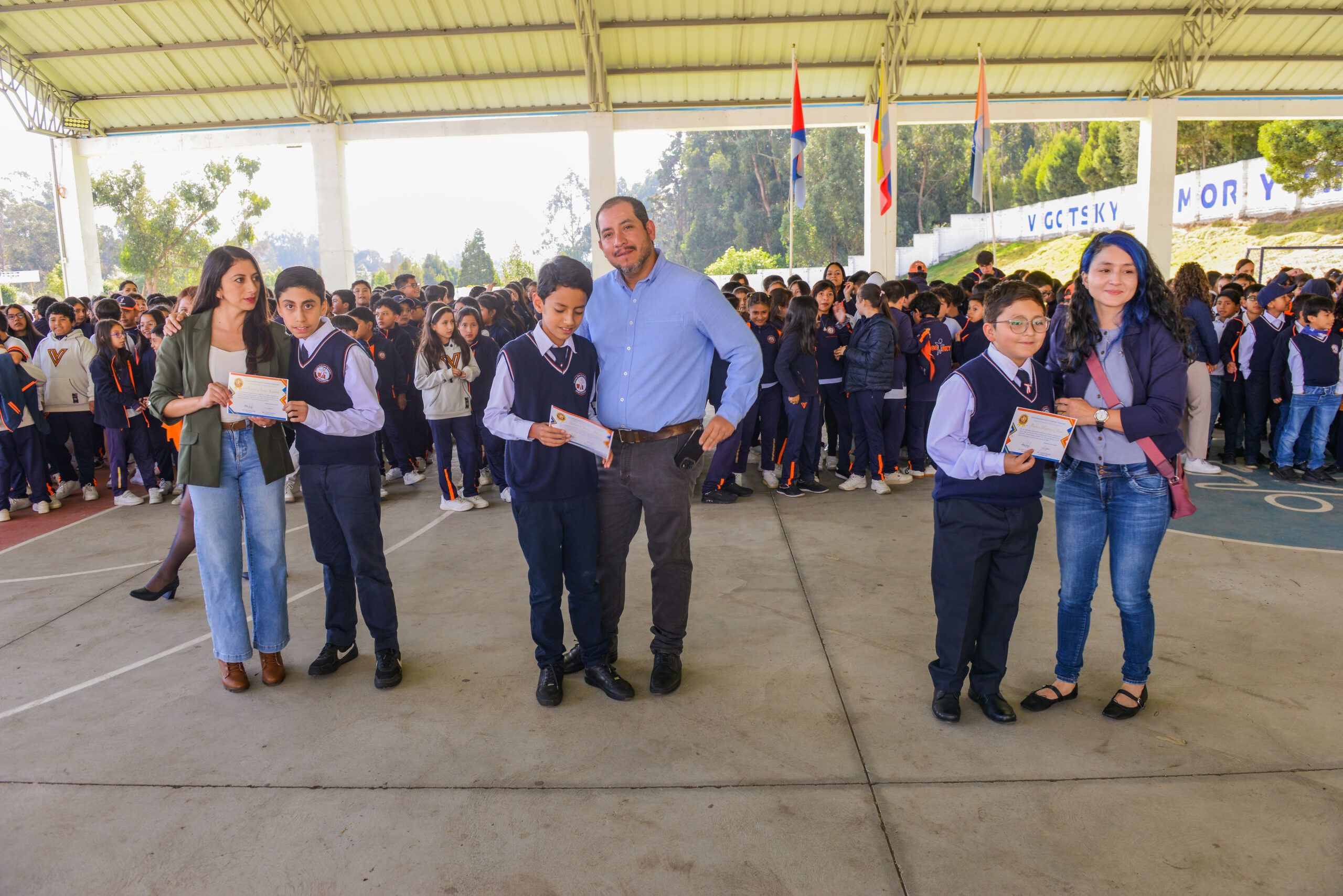 La Unidad Educativa Vigotsky realizó la entrega de certificados de reconocimiento a los estudiantes que obtuvieron los tres mejores promedios académicos durante el primer trimestre del presente año lectivo, desde Quinto de Educación General Básica hasta Tercero de Bachillerato.